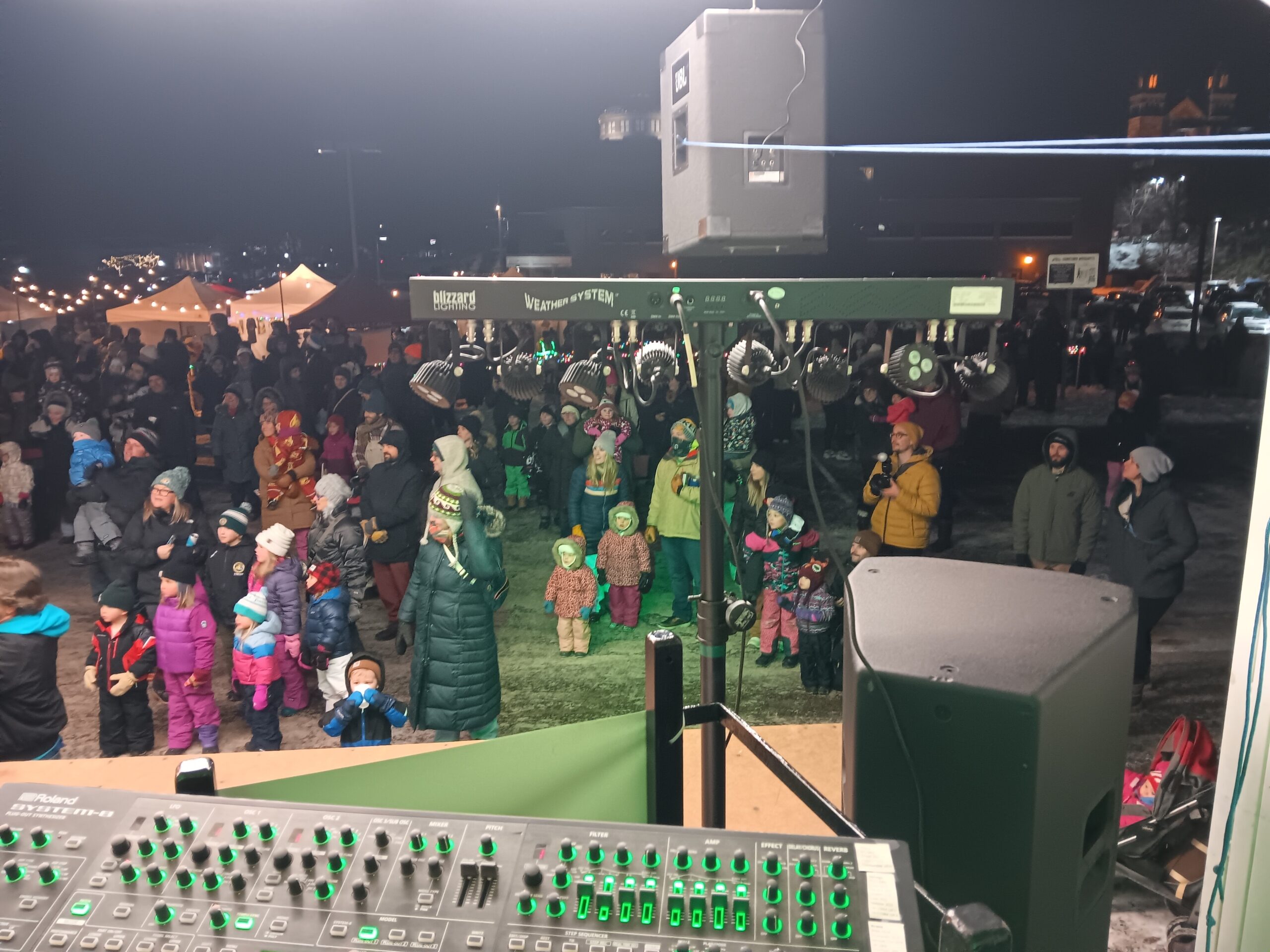 29 songs went off without a hitch other than it was so cold, “the Teens”, and Todd’s trombone iced shut, Eric’s wah wah pedal would not wah, Glenn’s trumpet kept giving him challenges, but somehow outdoorsman Luke Noordyk was able to jam on the bass and run sound with his roving tablet too!
